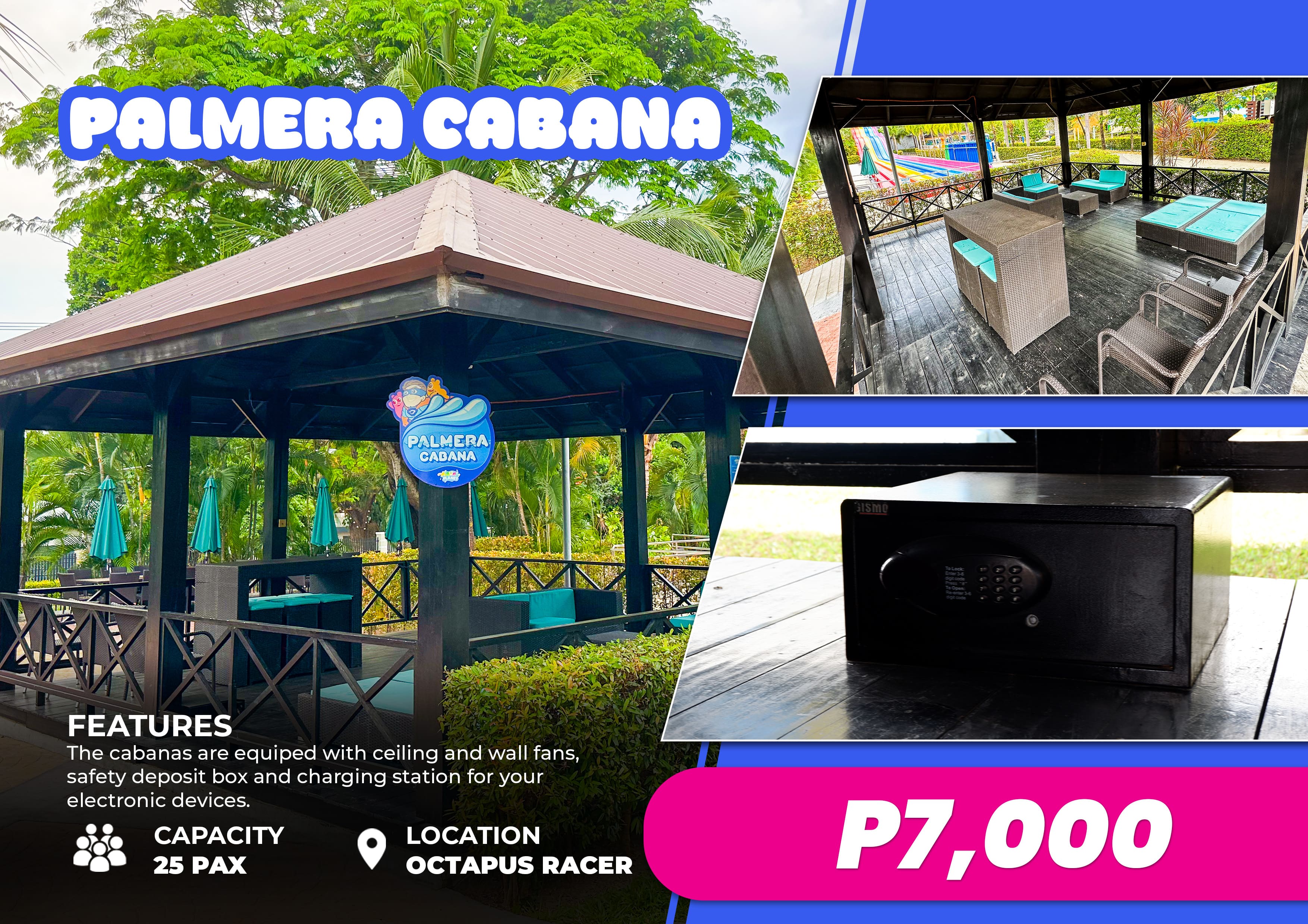 The Palmera Cabana is perfect for big groups. It is equipped with ceiling and wall fans, safety deposit boxes, and charging station for your electronic devices.